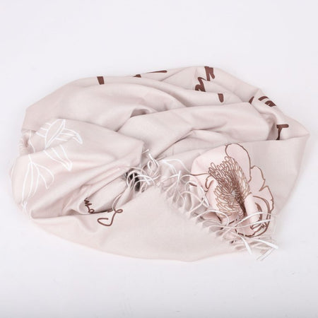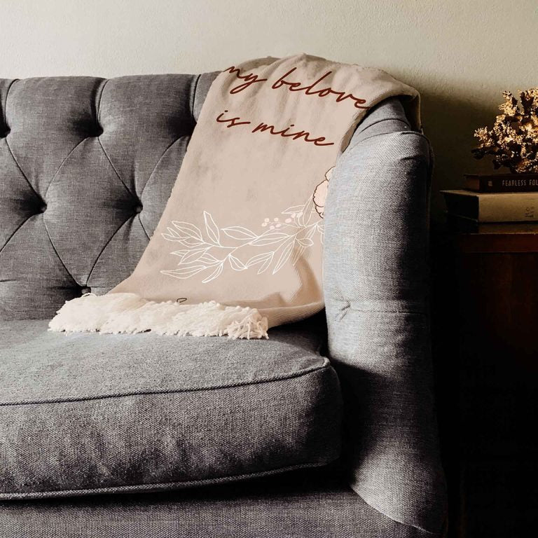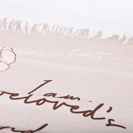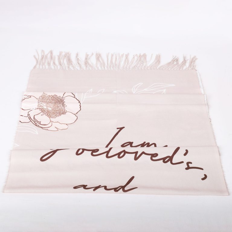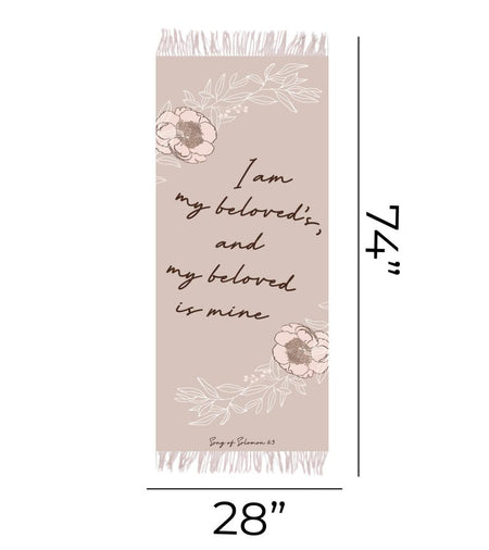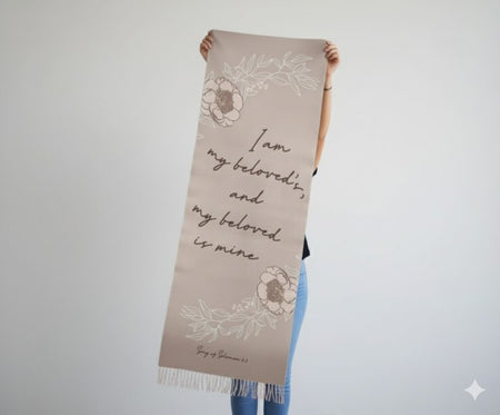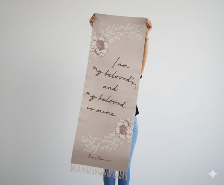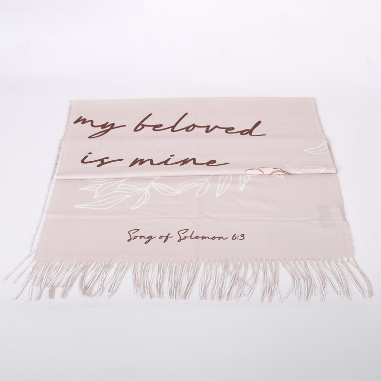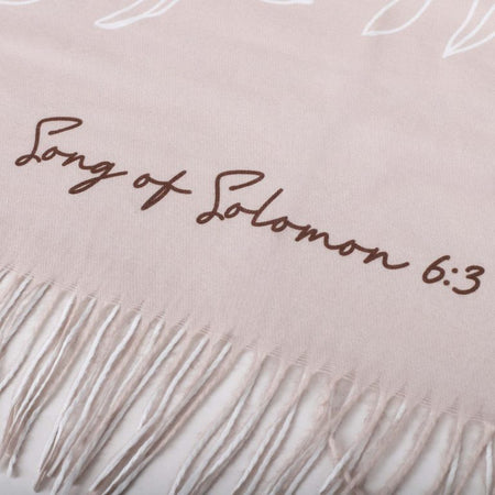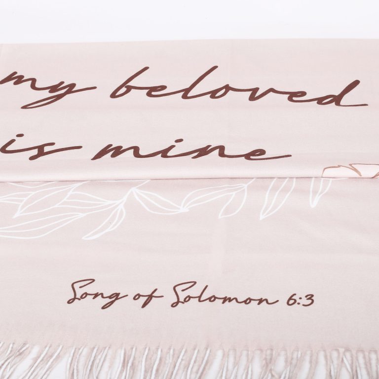 The shawl’s soft mauve-pink hue and minimal floral design exude warmth and serenity, while the scripture from Song of Solomon 6:3, “I am my beloved’s and my beloved is mine,” adds a deeply personal touch of faith and love.