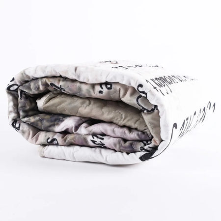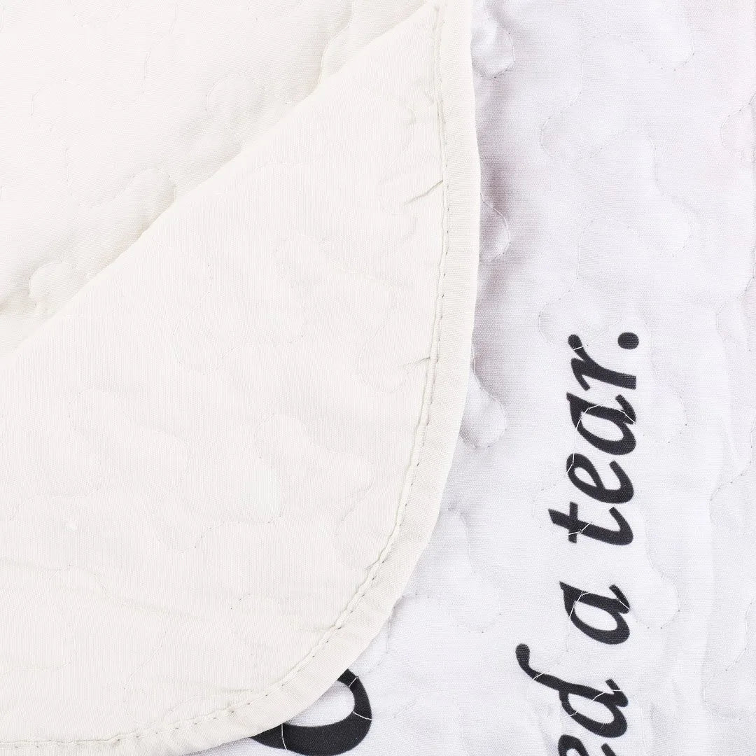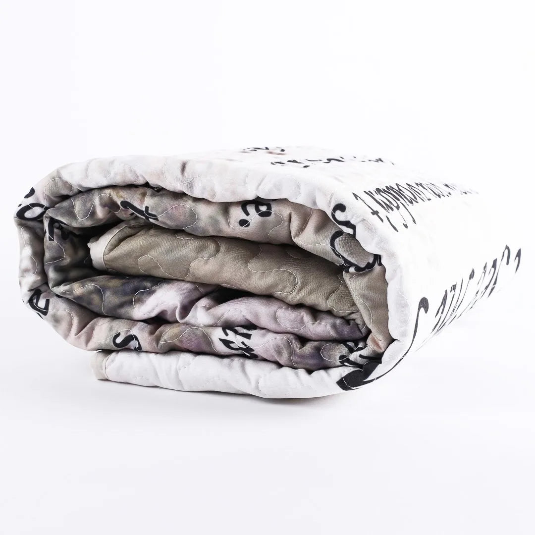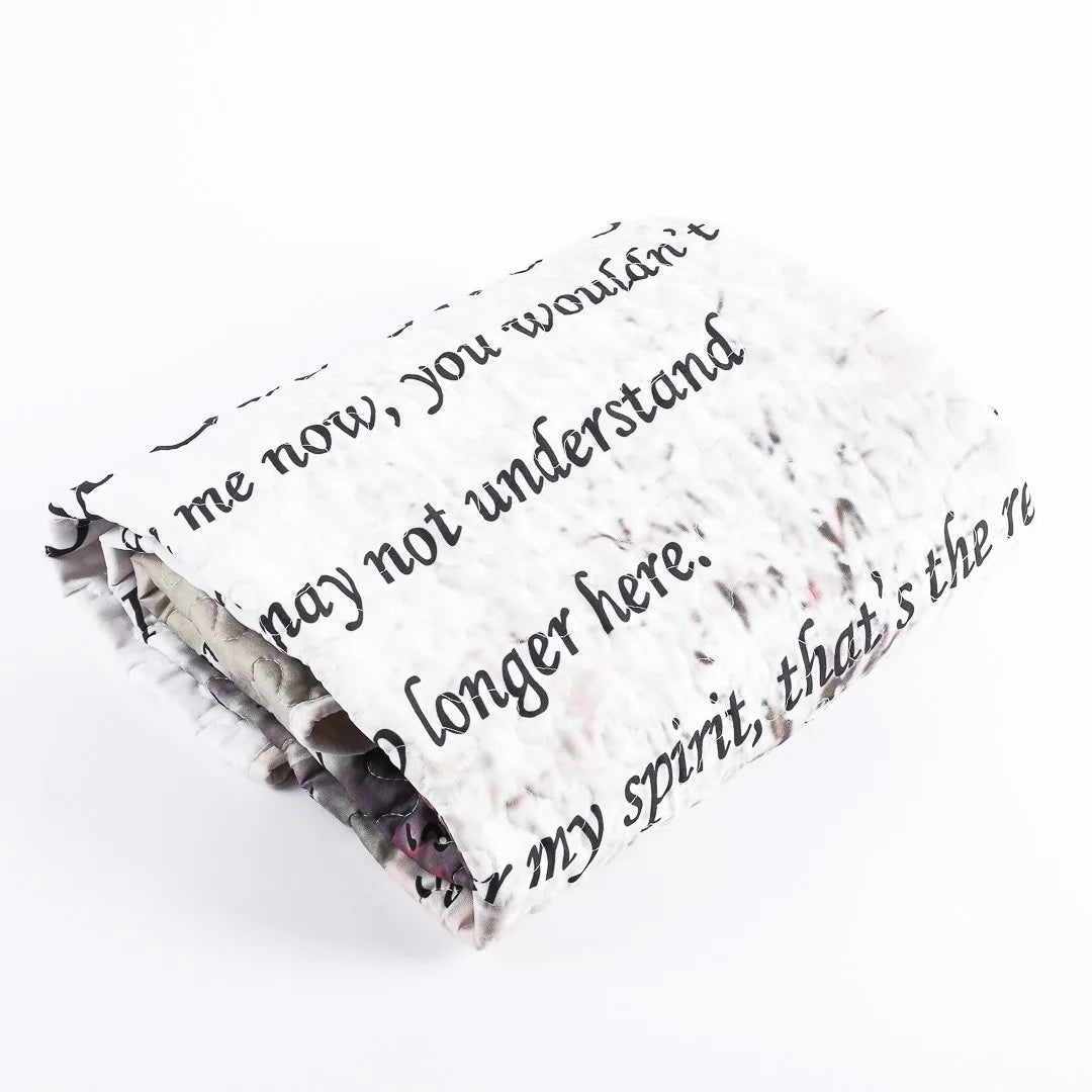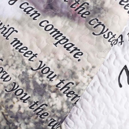 Snuggle up in style with our Quilted "If You Could See Me Now" Throw – a cozy companion for your moments at home. Measuring at 50 x 60 inches, this remarkably lightweight throw is a must-have addition to your blanket collection. Made for comfort, the outer layer is 100% cotton, offering a soft and smooth feel, while the Poly-Cotton Filling provides a balance of warmth and breathability, making it ideal for year-round use. While the back of the throw boasts a neutral cream color, the front steals the spotlight with its vibrant and captivating scene. Combined with a message from "If You Could See Me Now," this throw is the perfect addition to your space. The sturdy stitching and unique wavy edge hem ensure durability and add a touch of elegance. And the best part? This throw is not only a stylish accessory to your home, it is also designed with practicality in mind. Machine washable, making care and cleaning a breeze, so you can keep it looking nice without the hassle. This quilted throw isn't just about looks – it's about making your downtime a little more inspired. Whether it's draped over your couch or thrown on your bed, our Quilted Throw adds a touch of charm to your space. Get ready for comfort, style, and a bit of grace all rolled into one cozy package.