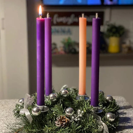 Bring the beauty of the Advent tradition to your table with this elegant dinner candle set from Lucid Candles. The set features three deep purple dinner-candles and one peony (soft rose-pink) dinner-candle — perfect for marking the four Sundays of Advent. Crafted for real flame ambiance without the mess of wax drips, this set is designed for ease, elegance, and tradition.