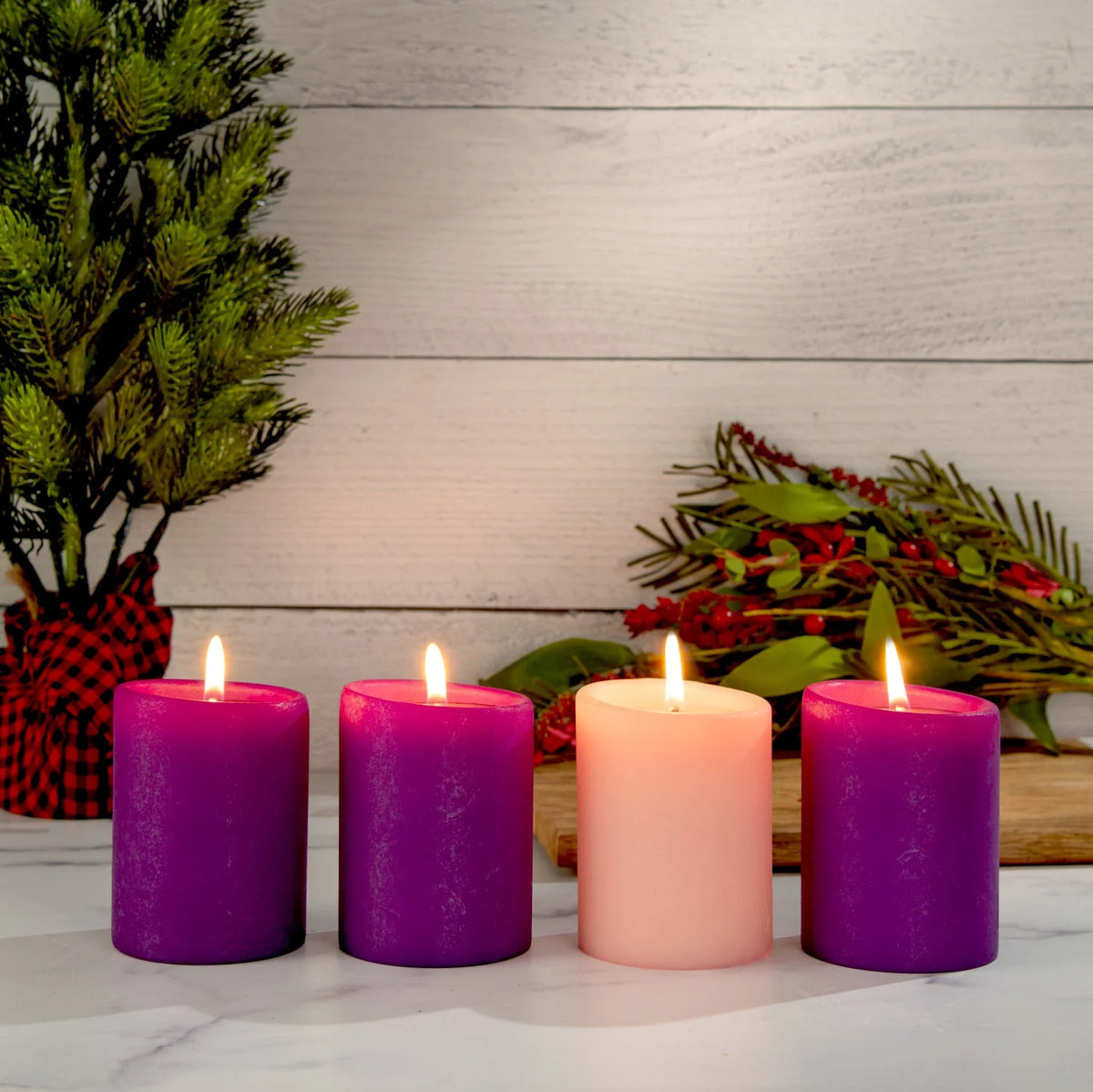 Refillable Advent Pillar Candle Set | 3 Purple + 1 Rose Pink | Heights: 4″ 6″ or 8″