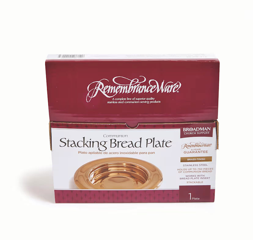The RemembranceWare: Communion Stacking Bread Plate - Brass Finish is made of the same high-end, food grade stainless steel as are all RemembranceWare pieces. It achieves it's unique brass hue through a multi-step finishing process. It is designed to stack neatly with other Communion Stacking Bread Plates. It features a one piece construction which creates the stacking feature to the bottom of the plate. It has a curved rim for easier passing. The Communion Stacking Bread Plate is standard size (1 3/4" high and has a diameter of 10 1/8"). Edges are double rounded to ensure a smooth and safe feel to this piece. RemembranceWare pieces are easily cleaned with mild soap and water and a soft cloth. This piece carries a 5-Year Guarantee and is beautifully boxed.