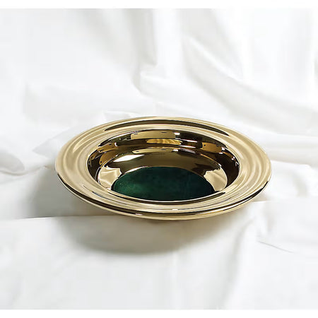 The RemembranceWare: Offering Plate - Brass with Green Felt is made of the same high-end, food grade stainless steel as are all RemembranceWare pieces. It achieves it's unique brass hue through a multi-step finishing process. This Offering Plate features a dark green felt pad on the inside bottom to soften noise during offering collection. It has a curved rim for easier passing.