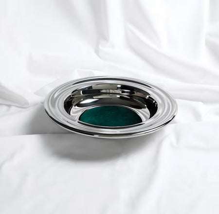 The RemembranceWare: Offering Plate - Silver Finish with Green Felt is made of the same high-end, food grade stainless steel as are all RemembranceWare pieces. It achieves it's beautiful silver shine through a polishing process. This Offering Plate features a dark green felt pad on the inside bottom to soften noise during offering collection. It has a curved rim for easier passing. The Offering Plate is standard size, measuring 2 2/4" high and has a diameter of 12". The felt pad has a 5 1/2" diameter. Edges are double rounded to ensure a smooth and safe feel to this piece. RemembranceWare pieces are easily cleaned with mild soap and water and a soft cloth. This piece carries a 5-Year Guarantee and is beautifully boxed."