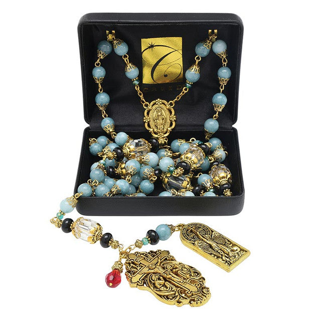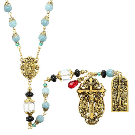 - 8mm Single-Capped Aquamarine Bead, 11x13mm Double-Capped Faceted Crystal Our Father Beads, 27" L, 2" Crucifix, 1" Miraculous Centerpiece, 1 1/2" Saint Michael Dangle