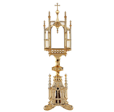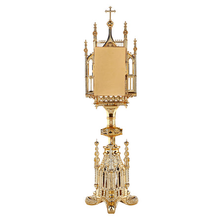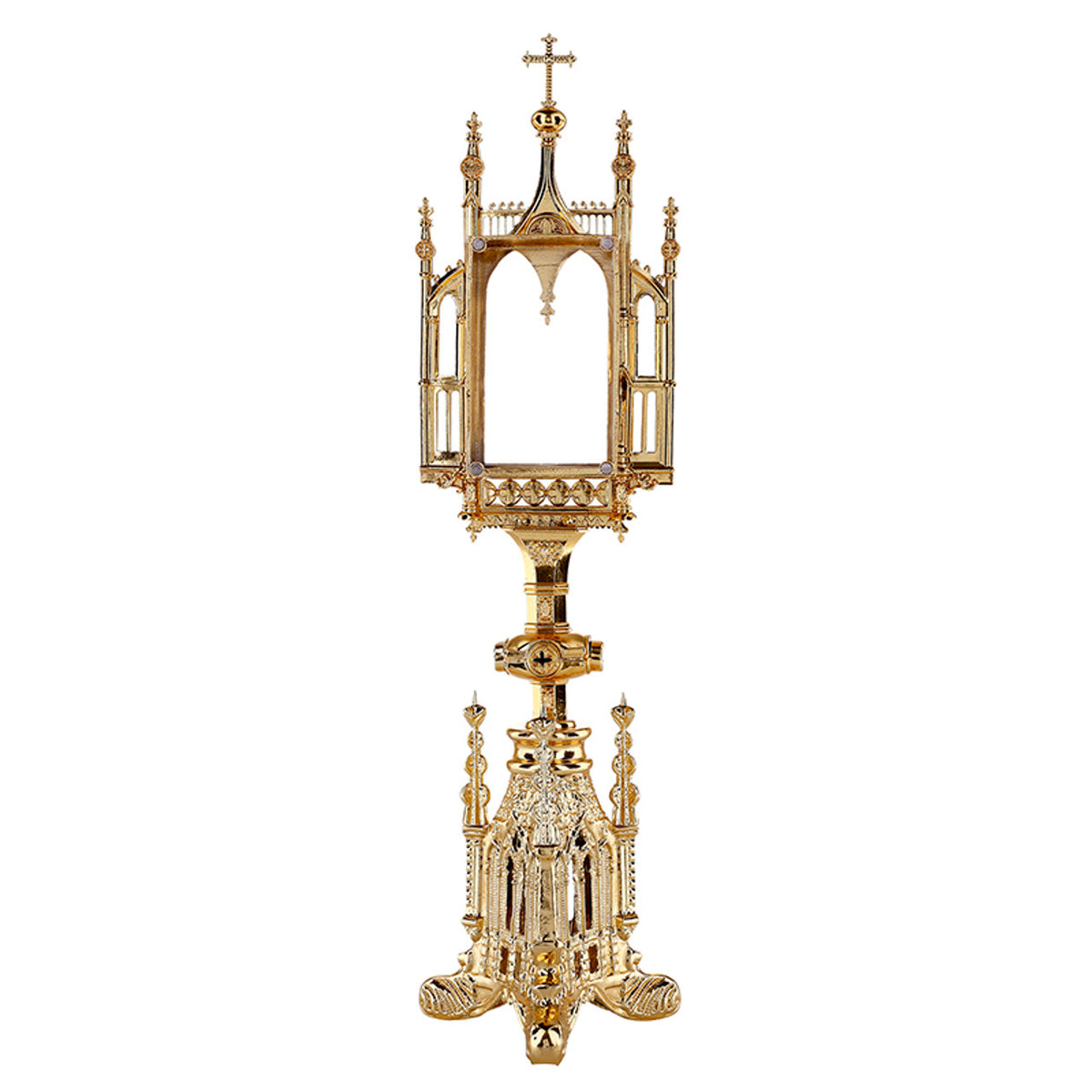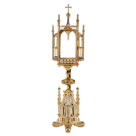Sudbury Brass San Pietro Collection 18"H reliquary features a Fleur-de-Lis Cross on top and an ornate, Gothic design reminiscent of Great European churches to complement your chapel area. An ideal appointment for displaying your Sacred Relics. Crafted from solid brass with a high polish finish. Reliquary does not come with luna.