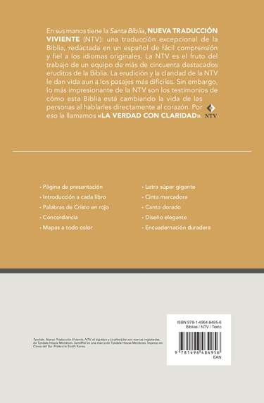El lenguaje claro, cálido y de fácil comprensión de la Nueva Traducción Viviente (NTV) se presenta aquí en letra súper gigante. Con un tamaño de letra de 14 puntos, esta Biblia es ideal para la lectura desde el púlpito y también hace que la lectura personal y devocional sea una experiencia muy placentera. Sus características incluyen: