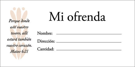 Special Offering Envelopes, in Spanish, are large enough to hold currency or a check without folding. Each envelope has space for name, address, amount given along with appropriate Scripture emphasizing the envelope's particular use.