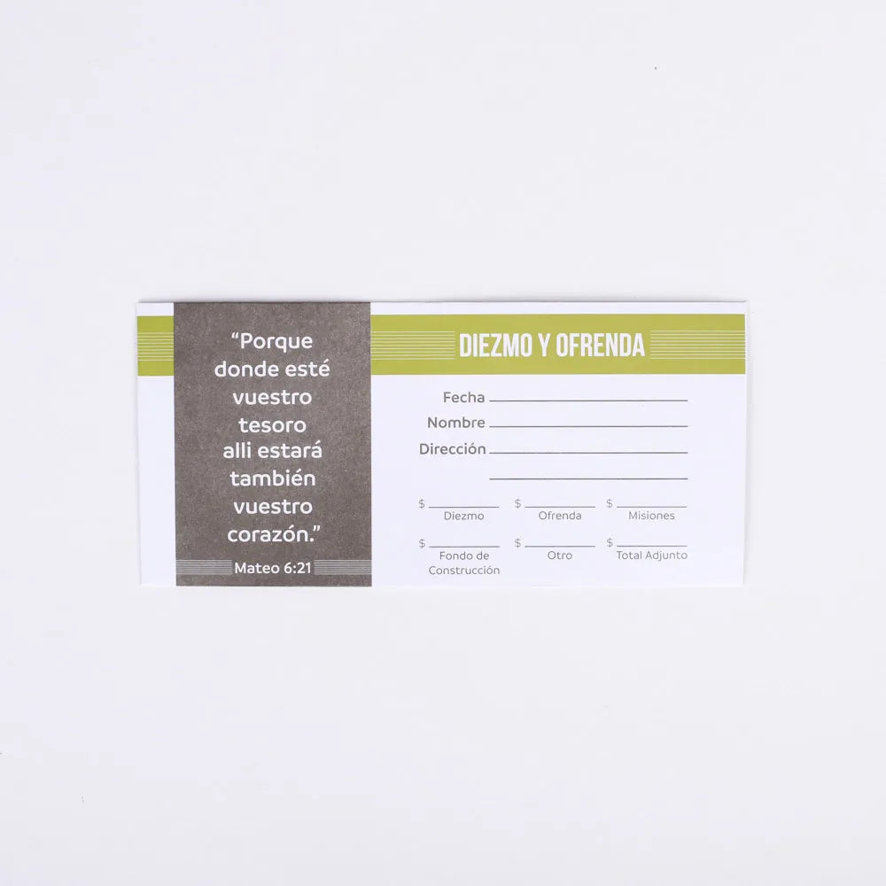 Front Design: “Tithe & Offering”. An classic design in green and featuring Matthew 6:21, plus write-in slots for date, name, address, and amounts.