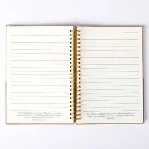 Crisply lined pages with inspiring scripture verses at the bottom provide plenty of room to take notes, or process your thoughts. The sleek gold spiral and hard covers allow this journal to withstand daily wear and tear while allowing it to lay completely flat while open to either page.