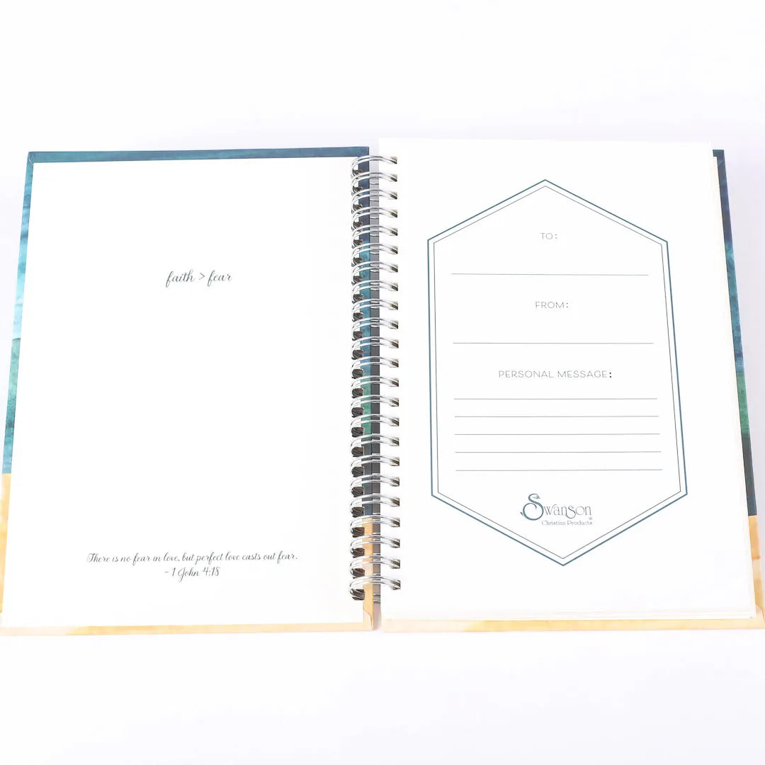 Take heart with this uplifting journal. The cover features the inspiring words “Perfect love casts out fear.” Watercolor shades of blue, green, and orange offer a bold backdrop and a welcoming space to process your innermost thoughts and prayers through writing.