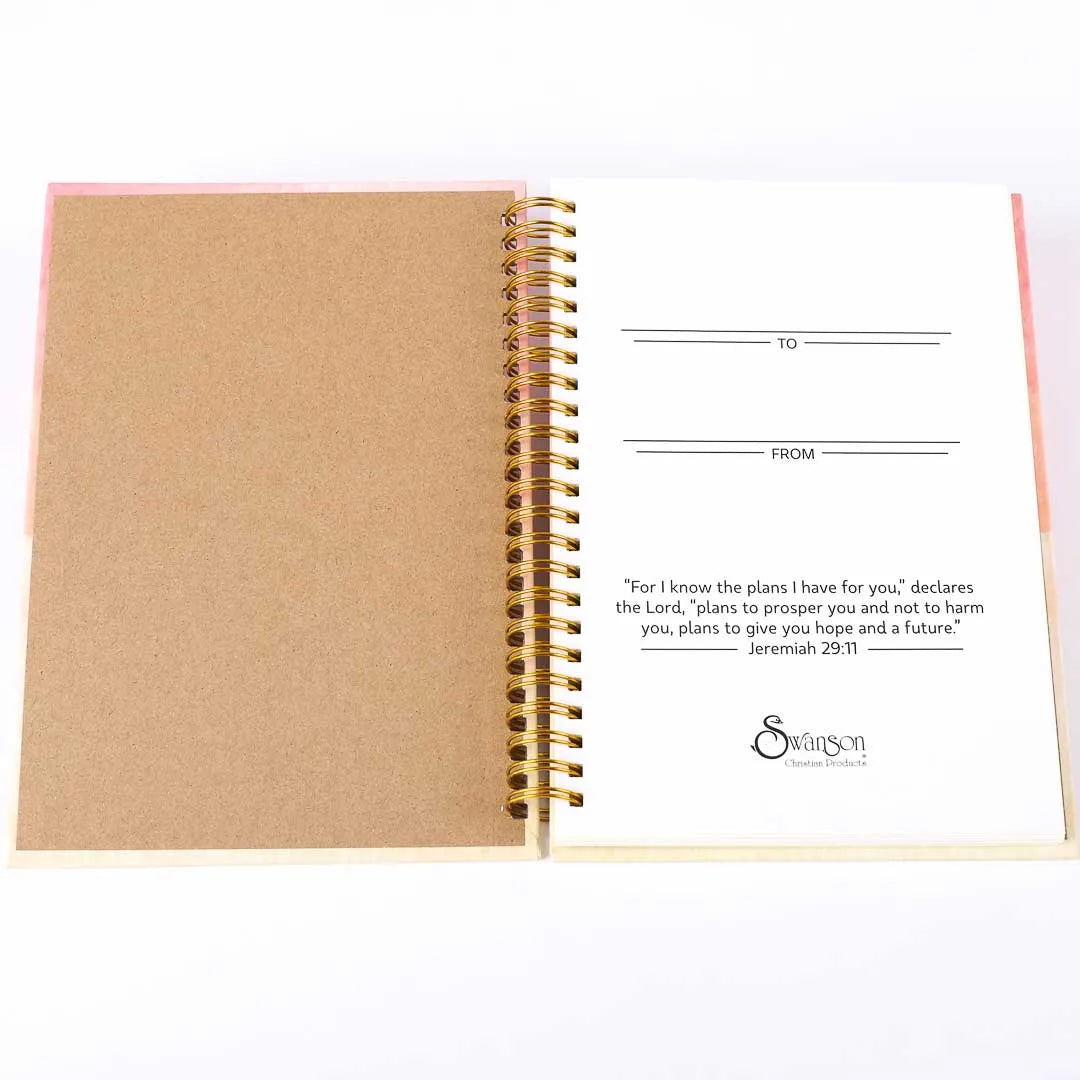 Crisply lined pages with inspiring scripture verses at the bottom provide plenty of room to take notes, or process your thoughts. The sleek gold spiral and hard covers allow this journal to withstand daily wear and tear while allowing it to lay completely flat while open to either page.