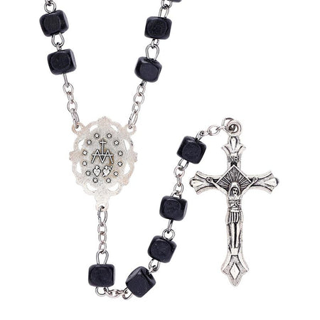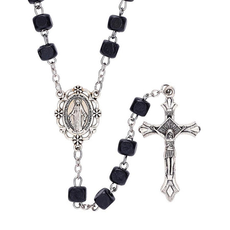 Square Black Bead Rosary | Wood with Antique Silver Accents | Pack of 12