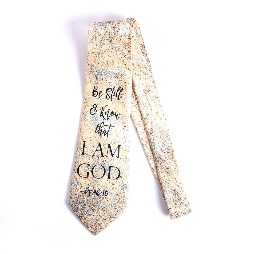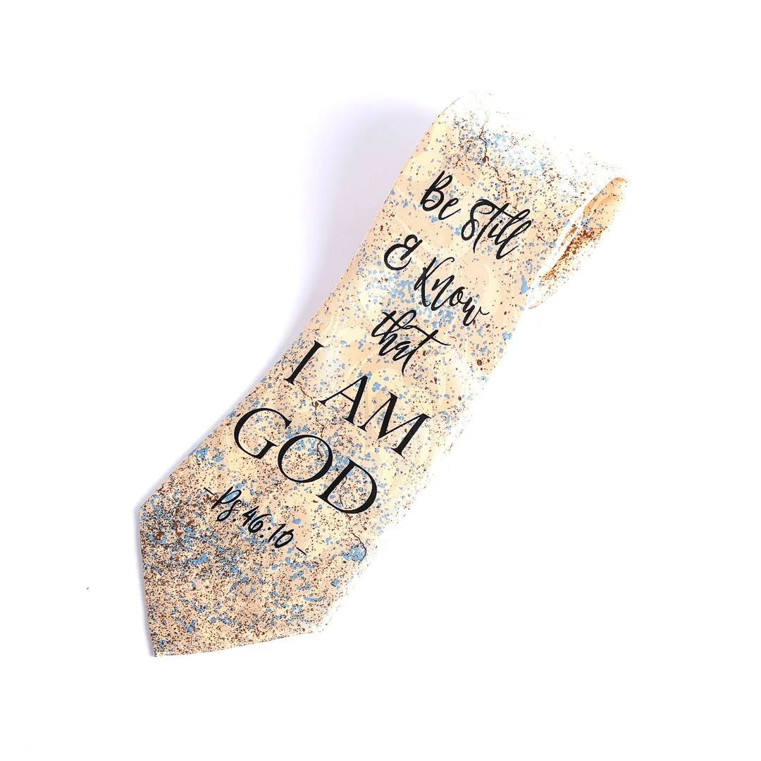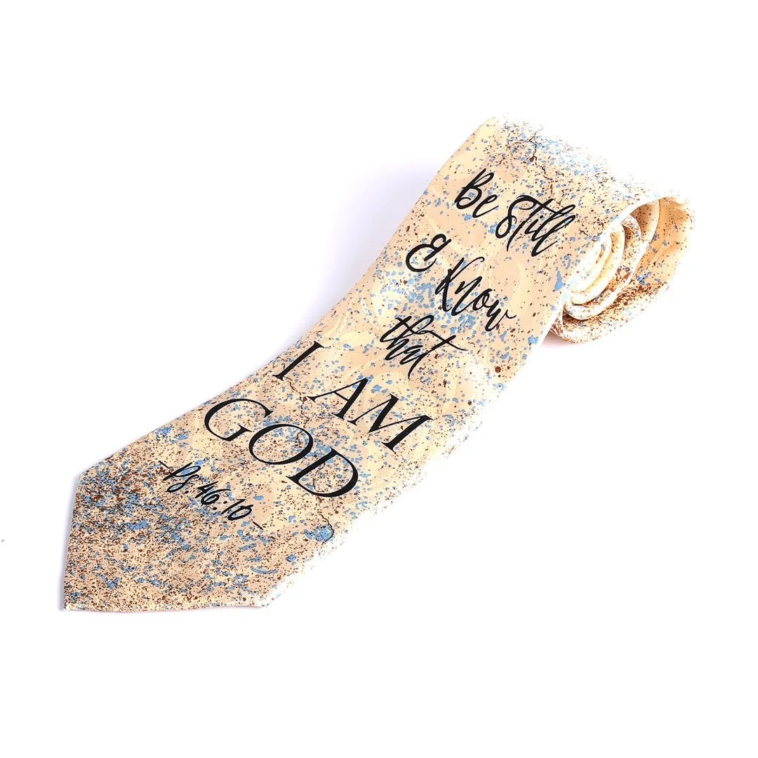 Handprinted Men’s Tie – “Be Still and Know That I Am God” Psalm 46:10, Navy Blue Jacquard Polyester