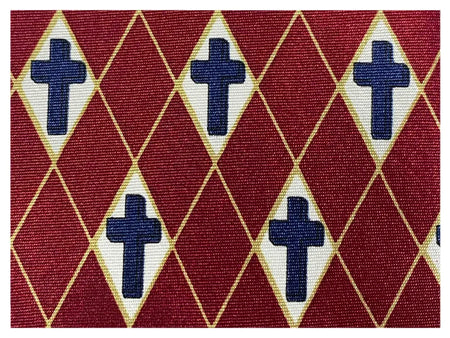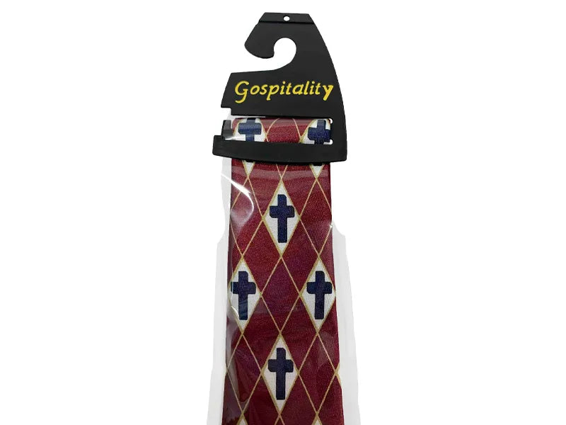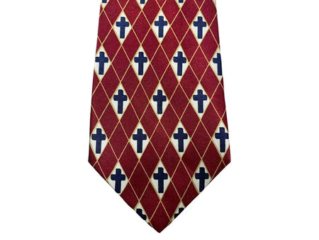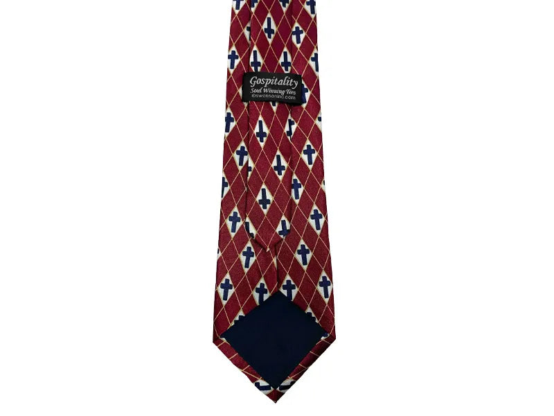 The tie showcases a distinctive pattern of crosses and diamond shapes in stunning shades of blue and white, all set against a rich burgundy-colored base. This sophisticated design adds a bold yet elegant touch to any outfit, perfect for both formal events and casual nights out.
