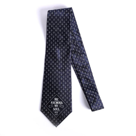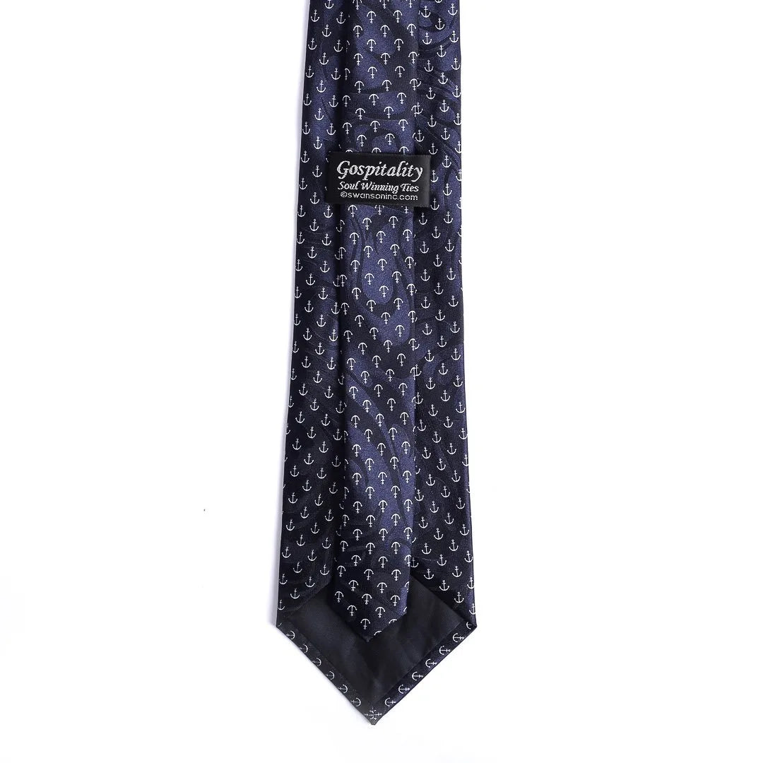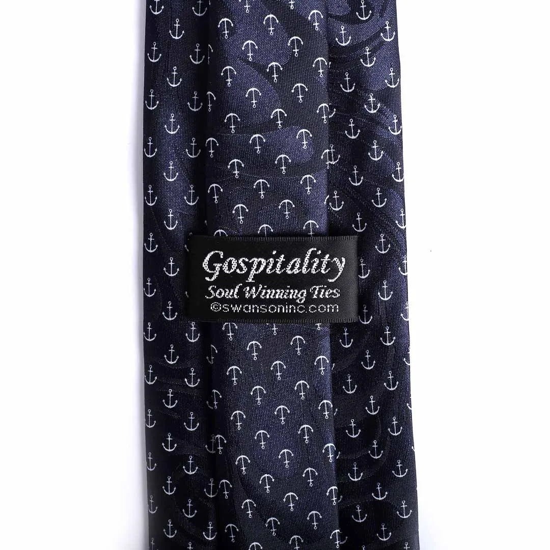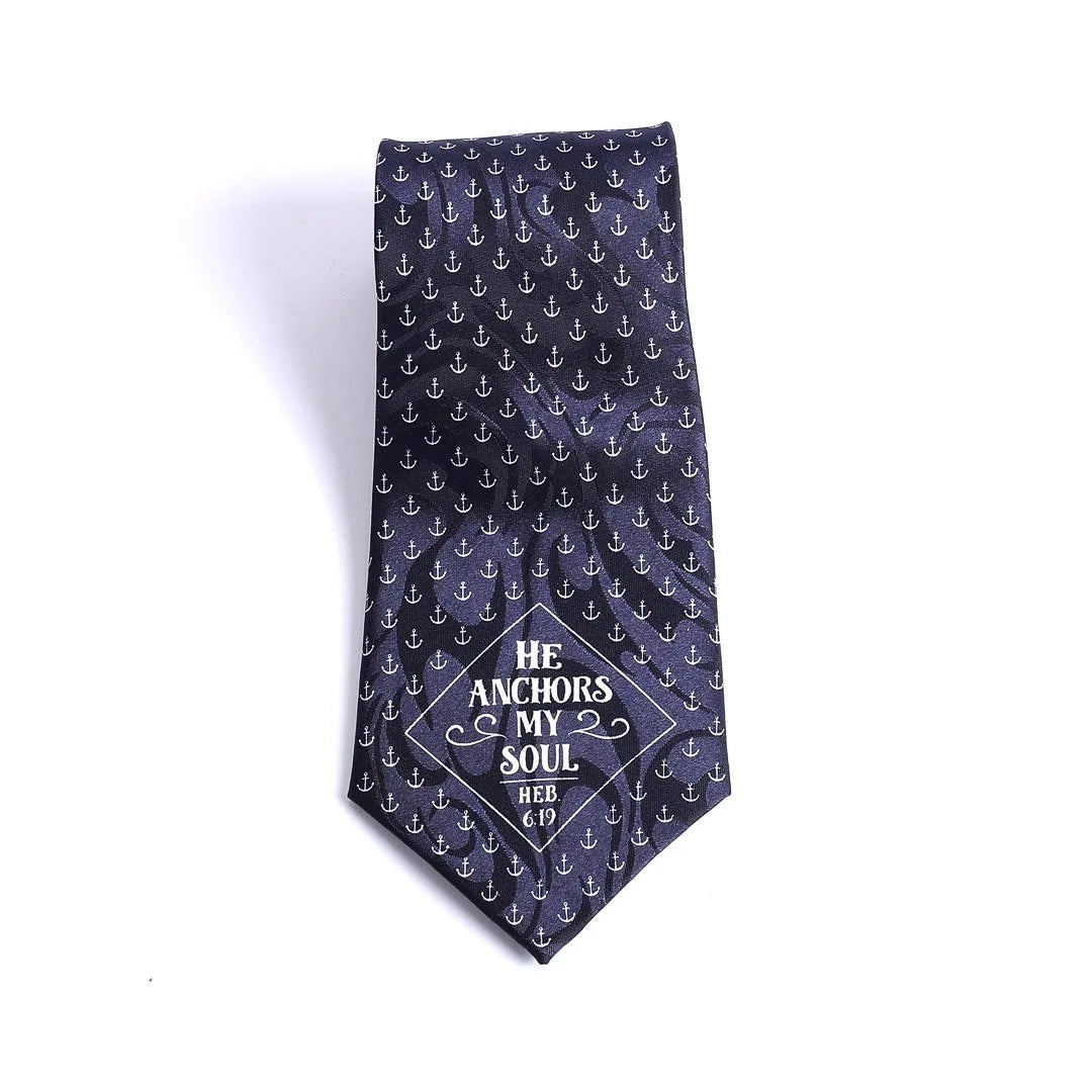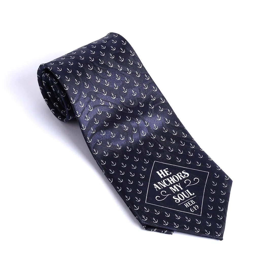 This tie showcases a beautiful pattern of white anchors on a navy blue background, paired with the inspiring text, “He Anchors My Soul,” from Hebrews 6:19. The combination of the classic anchor motif and the uplifting scripture creates a timeless and meaningful design that is perfect for expressing both faith and style.