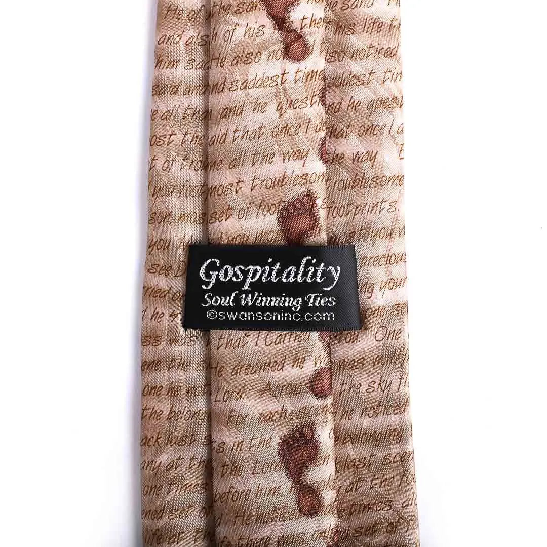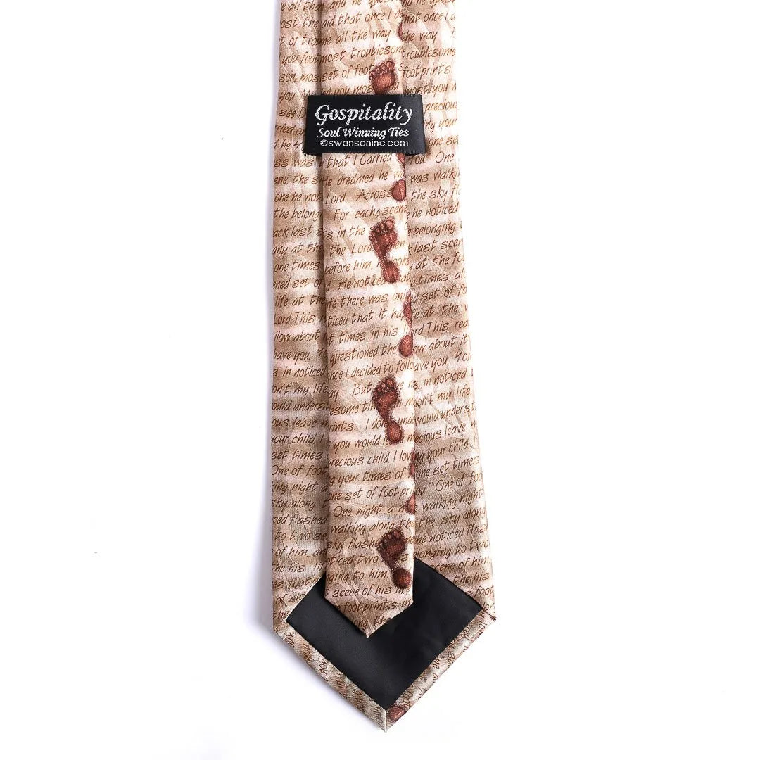 The design showcases a peaceful sandy scene with the classic “footprints” imagery, accompanied by the inspiring words “He carries me.” This tie serves as a beautiful reminder of faith and comfort, making it perfect for those who want to wear something meaningful, while adding a touch of elegance to their look.