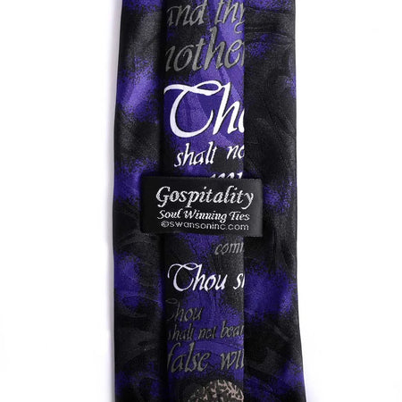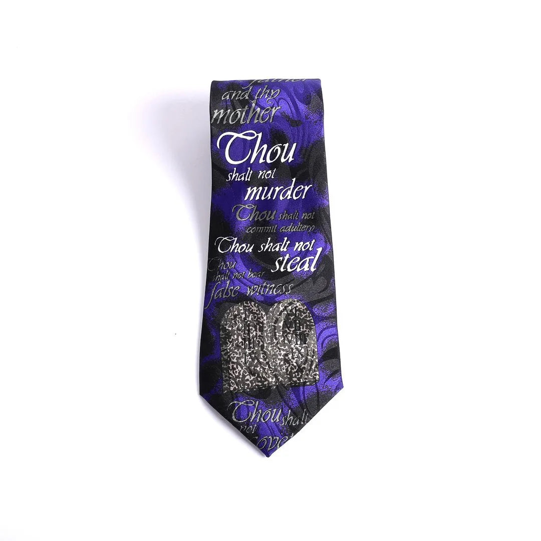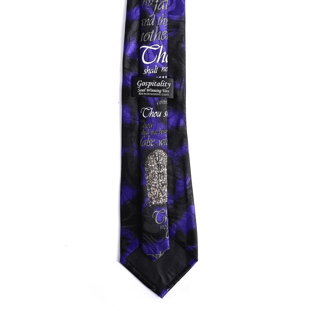 This bold tie comes in black and purple, with a one-of-a-kind pattern that displays the 10 Commandments in shades of white and grey. The unique design adds an element of spirituality and sophistication to any outfit, making it perfect for those who want to express their faith in style.