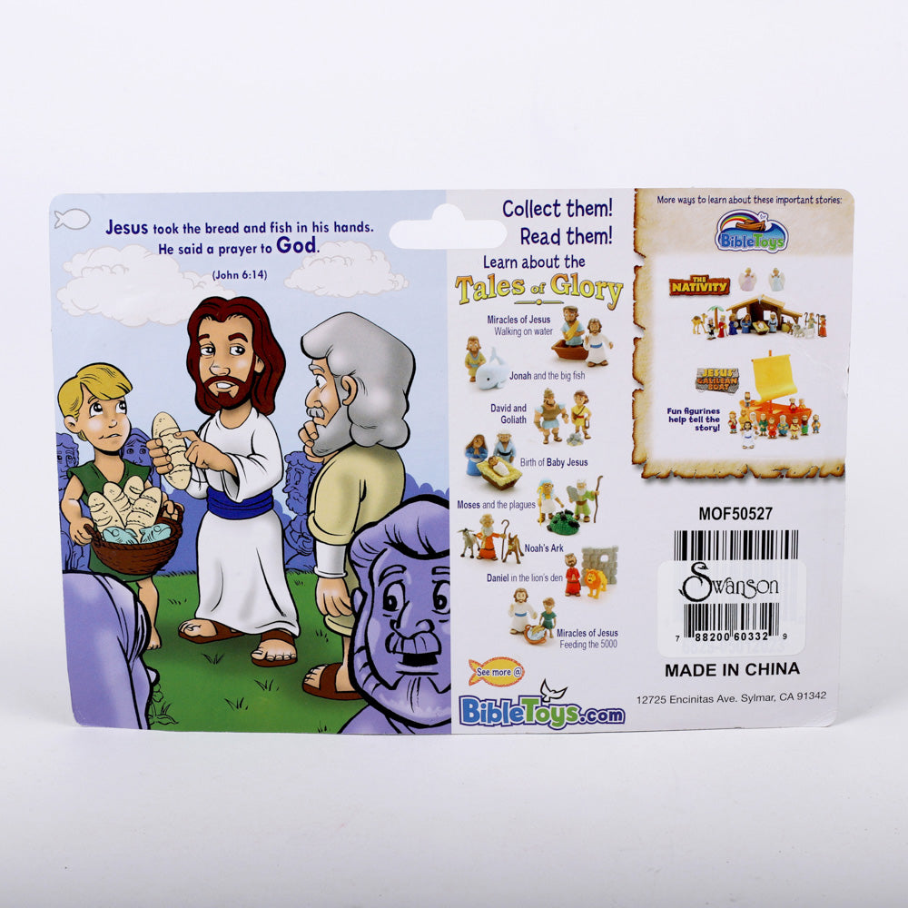 These fun figurines offer a new way to bring classic Bible stories to life, encouraging the imaginations of young children and helping them connect with these timeless tales. This set centers around the iconic story of Jesus multiplying the loaves of bread and fish to feed the crowd by including a figurine of Jesus himself, accompanied by a figure of the young boy and his basket of food. Additionally, the set comes with a mini storybook that recounts the faith-building story, specifically written to be accessible and engaging for young readers, making the story easy to understand and enjoy.