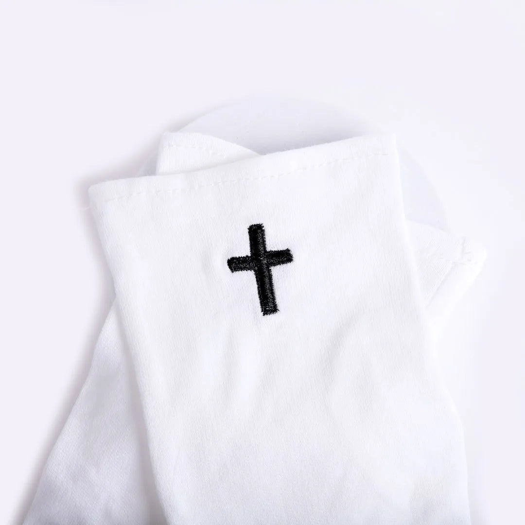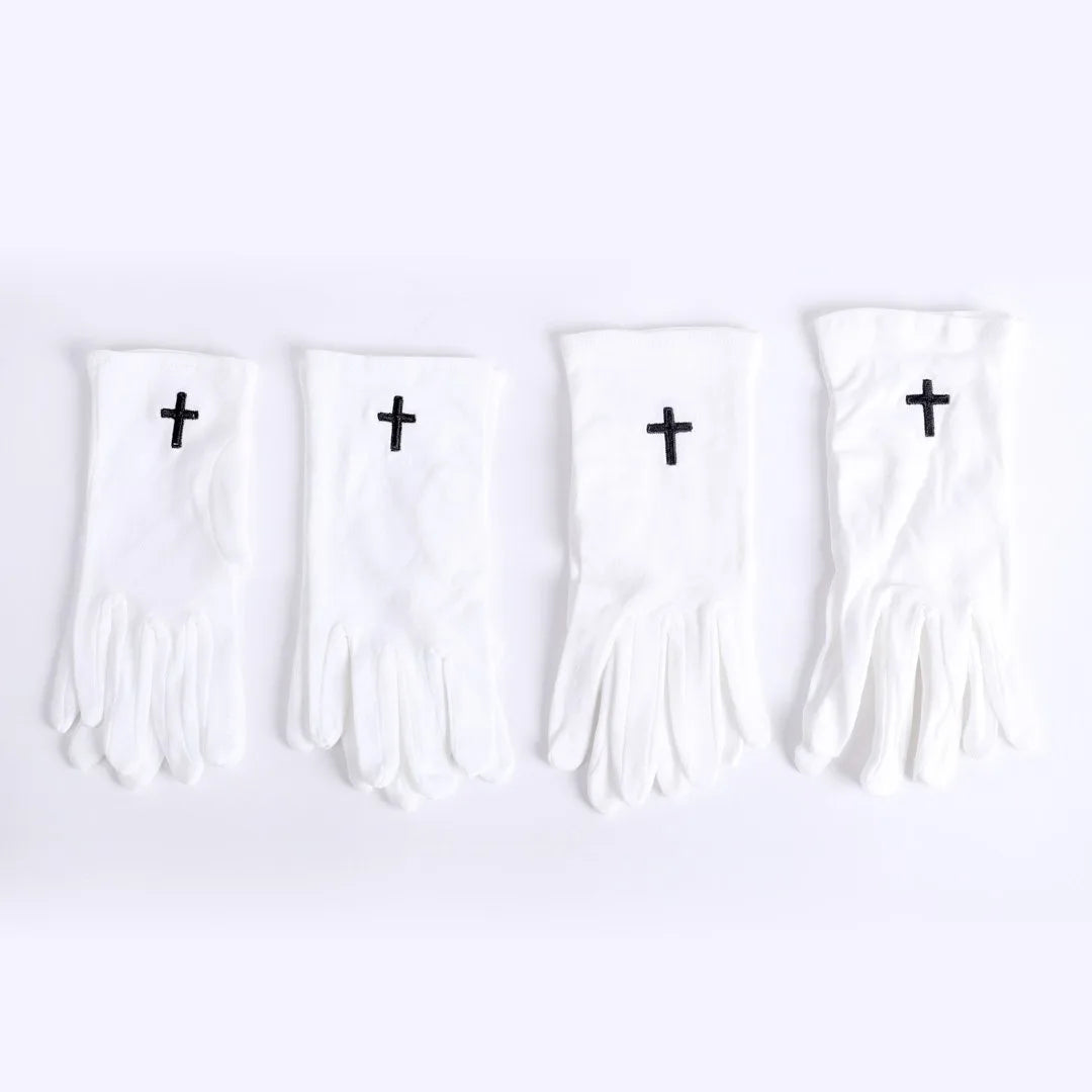 Crafted from 100% high-quality cotton, these gloves are lightweight and breathable, making them ideal for extended wear even during warm weather. The soft, durable fabric ensures all-day comfort while allowing flexibility and ease of movement. The black embroidered cross provides a subtle yet meaningful detail, making these gloves especially suitable for religious or ceremonial settings.
