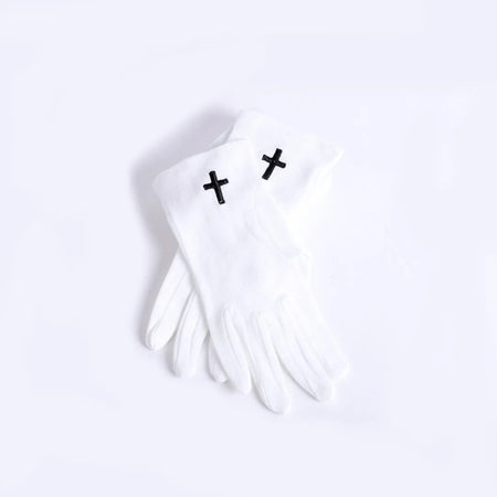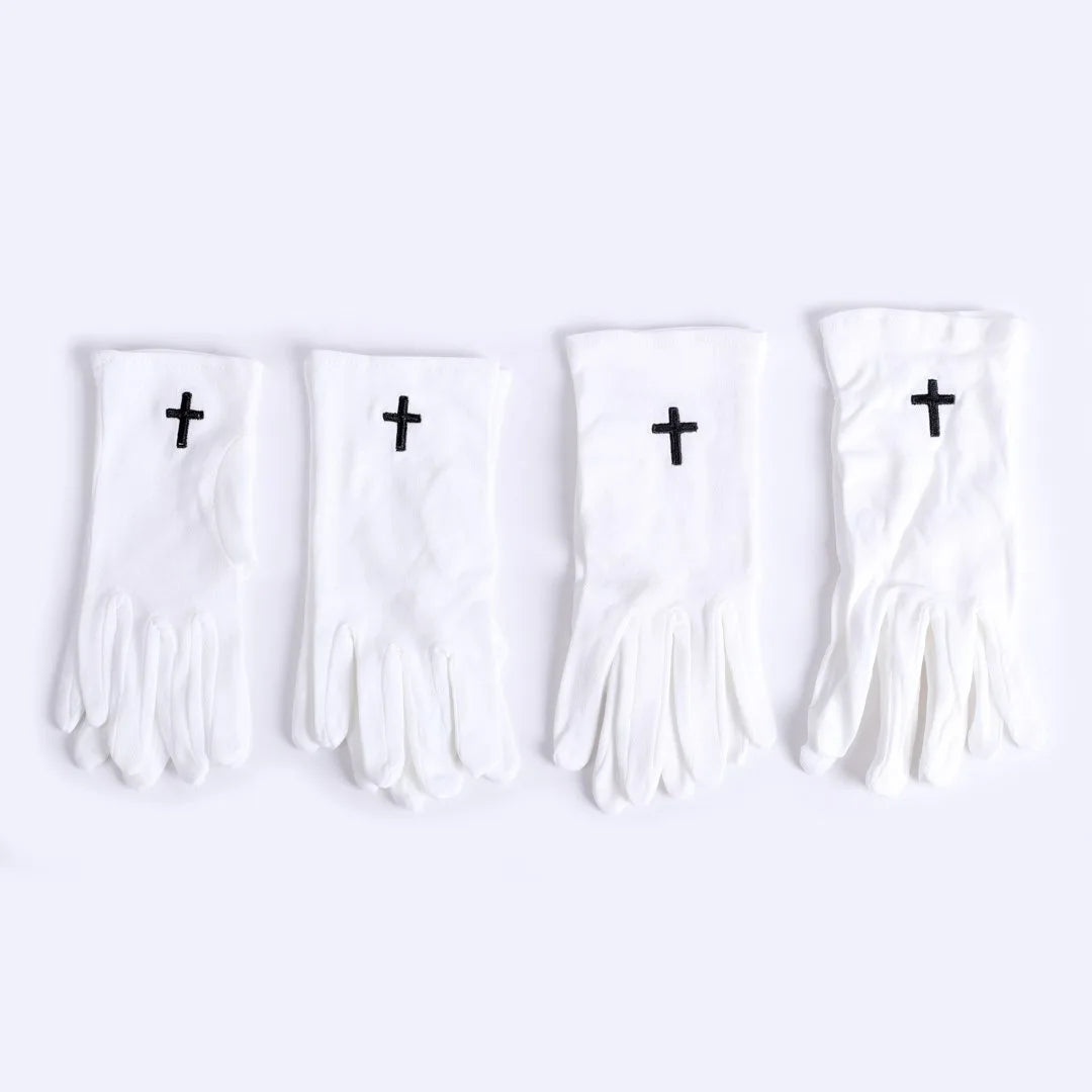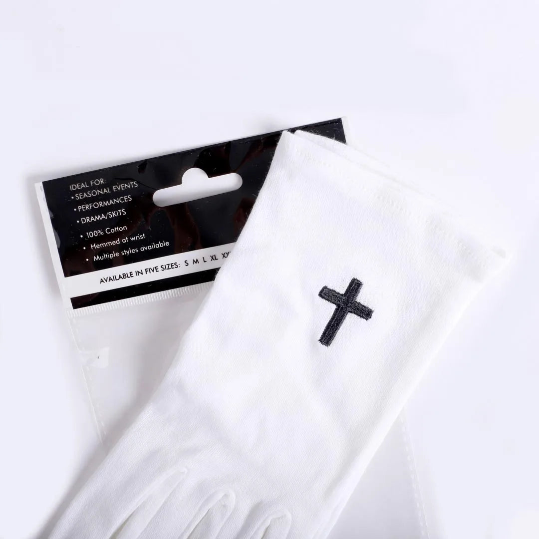 These white gloves with a small black embroidered cross are the perfect accessory for formal events, seasonal performances, and ceremonies. Ideal for ushers, greeters, deacons, pallbearers, and others in ceremonial roles, these gloves help project professionalism, cleanliness, and elegance. Whether you’re greeting guests, assisting at a religious service, or participating in a formal event, these gloves will add a polished touch to your appearance.