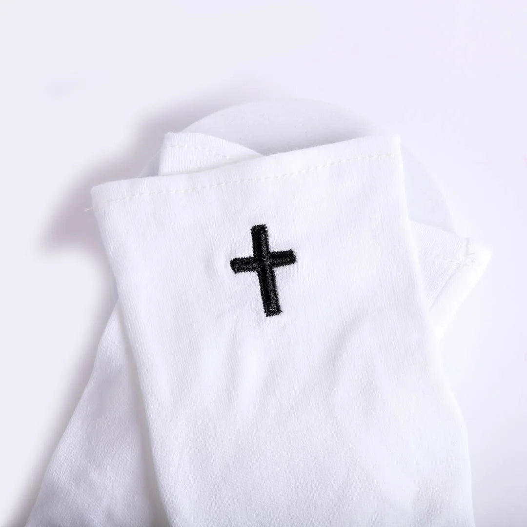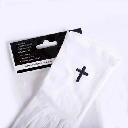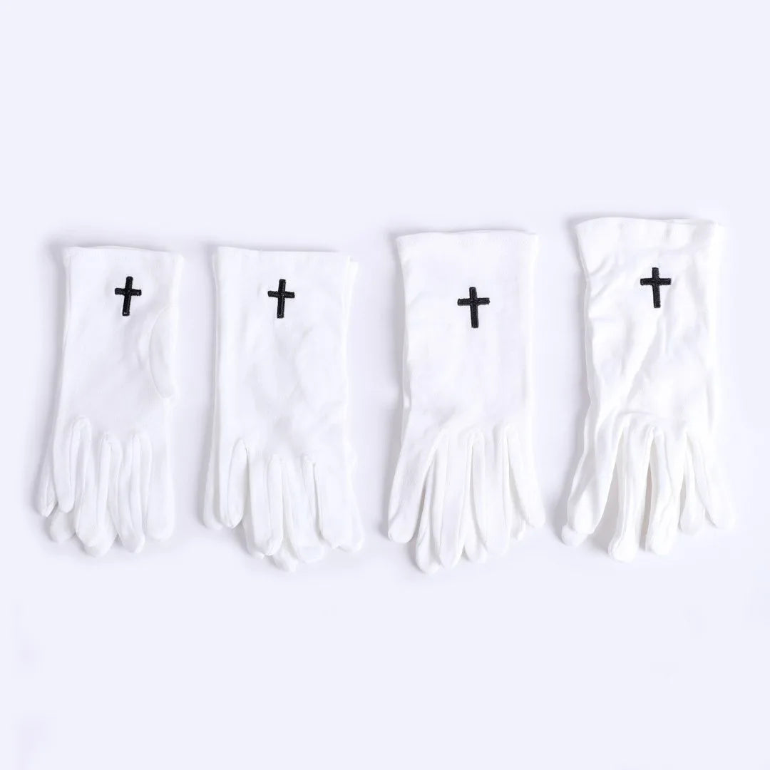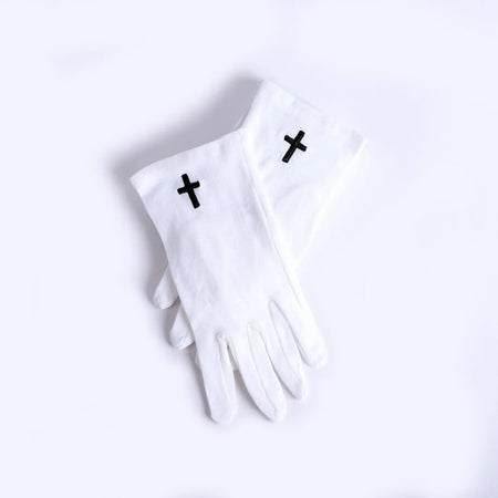 Crafted from 100% cotton, these gloves are lightweight, breathable, and comfortable, making them perfect for extended wear even in warmer weather. The soft fabric helps prevent discomfort or sweating, keeping you cool and comfortable during long events. Their simple, yet stylish design features a small, black embroidered cross, adding a subtle but meaningful detail to enhance the overall look.