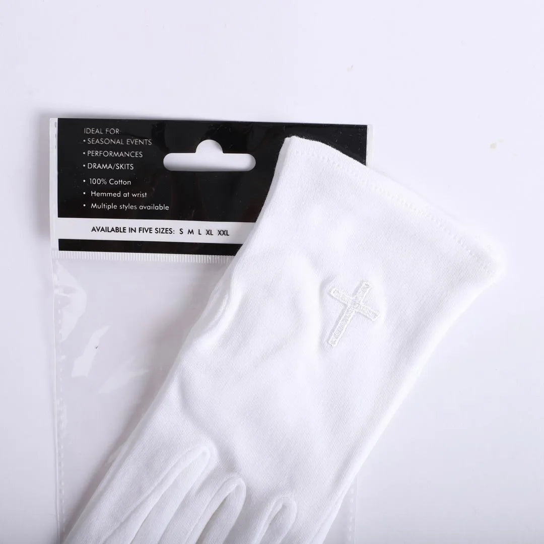 These premium white gloves with a small white embroidered cross are the ideal accessory for formal events, seasonal performances, and ceremonial occasions. Perfect for ushers, greeters, deacons, pallbearers, and others in professional or ceremonial roles, these gloves help project an air of professionalism, cleanliness, and elegance. Whether shaking hands, assisting at a church service, or participating in a special event, these gloves add a polished and refined touch to your attire.