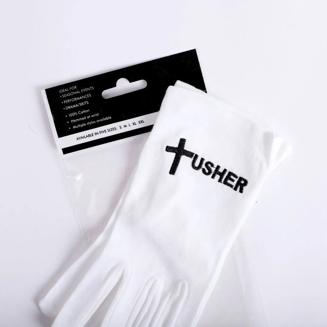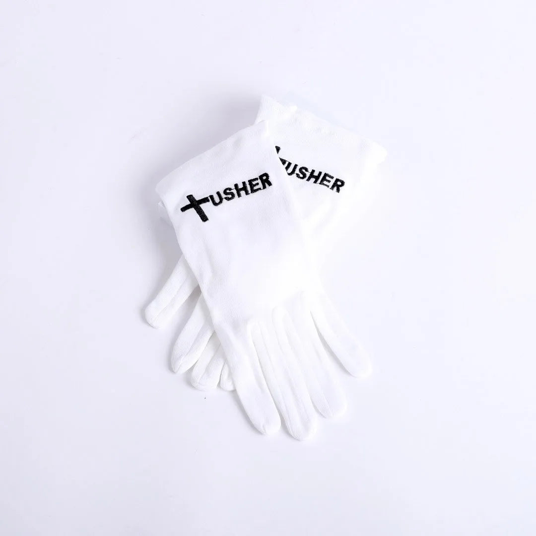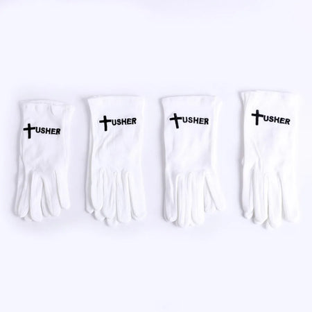 Enhance your professional appearance with these premium white gloves, featuring a small black embroidered “Usher” design. Perfect for seasonal events, performances, and formal gatherings, these gloves are ideal for ushers, greeters, deacons, pallbearers, and more. Whether you’re greeting guests, assisting in a religious service, or participating in ceremonial duties, these gloves are designed to project professionalism, cleanliness, and elegance.