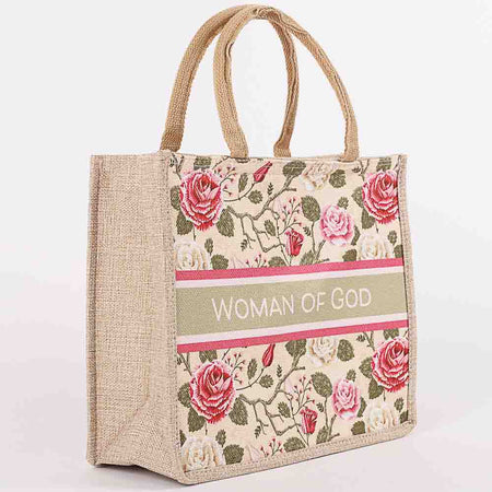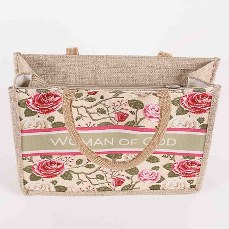 The tote’s elegant design features delicate floral accents in pink and green, creating a fresh and feminine aesthetic. The inspirational message “Woman of God” is prominently displayed, serving as a daily affirmation of your faith and purpose. This unique combination of beauty and function makes it an ideal accessory for everything from errands to church gatherings.